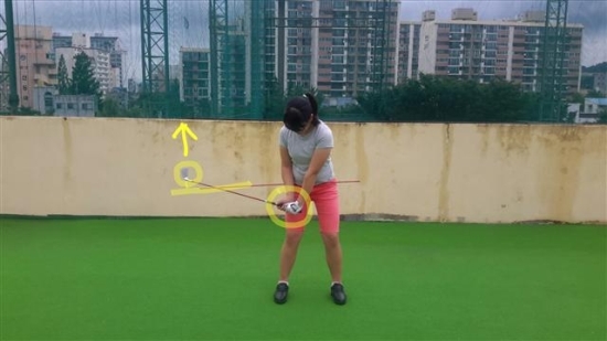 <사진1> 의 동작은 수평으로 만들어진 선을 클럽헤드가 아닌 손(원을 주목)이 먼저 닿아야 하는 것이다. 그렇지 않고 <사진2> 와 같이 클럽헤드가 먼저 닿게 되면 캐스팅 동작이 만들어져 뒤땅을 치기 쉽다. 또한 볼이 멀리 날아가지 않게 볼을 떠내는 동작(스쿱핑)도 하는 것이다. 사진2> 사진1>