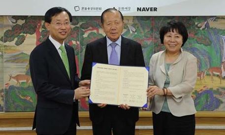| ▲ 김상헌 네이버 대표이사, 김동호 문화융성위원장, 나선화 문화재청장(왼쪽부터)이 업무협약을 마치고 기념사진을 찍고 있다. | ||