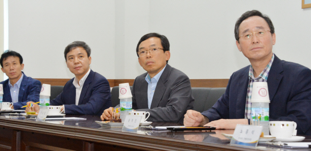 | ▲ 이승철 창조경제추진단장(오른쪽 두번째)이 30일 전주 효성탄소기업을 방문해 송하진 전북도지사와 김승수 전주시장과 함께 효성관계자로부터 사업 설명을 듣고 있다. 추성수기자chss78@ | ||