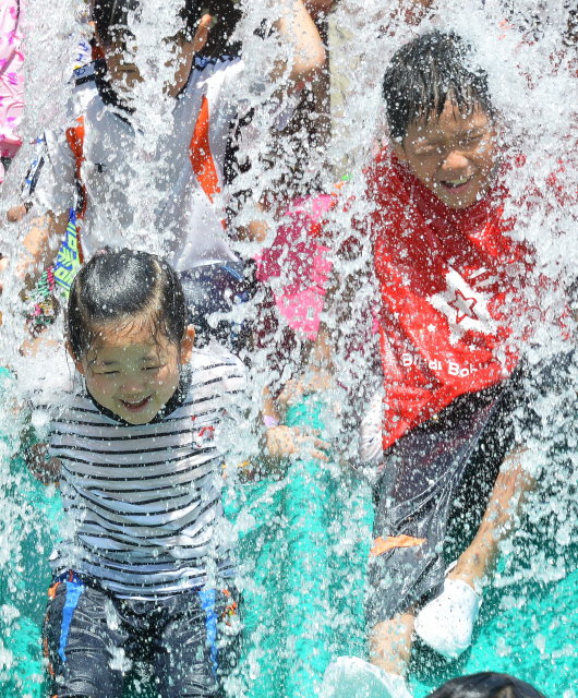 ▲ 전주의 낮 최고기온이 이틀 연속 35도를 웃돌며 올 들어 첫 폭염경보가 발효된 30일 전주 평화동 참새암공원에서 아이들이 쏟아지는 물줄기를 맞으며 더위를 식히고 있다. 추성수기자 chss78@