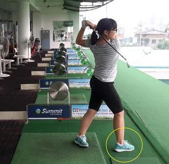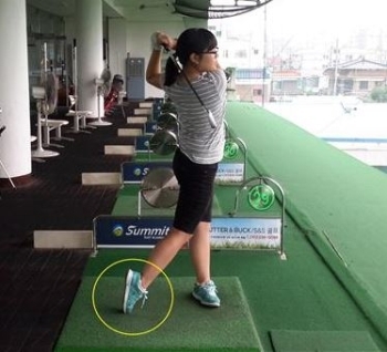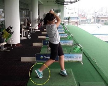 따라서 <사진3> 은 체중이동이 되지 않는 골퍼들을 위한 연습방법으로 오른발을 걸어가는 것처럼 해서 오른발이 왼발보다 앞서서 나와야한다. 그렇게 되면 체중이 가고 싶지 않아도 억지로 체중을 이동시키는 것이기 때문에 체중이동이 자연스럽게 이루어지게 된다. 사진3>