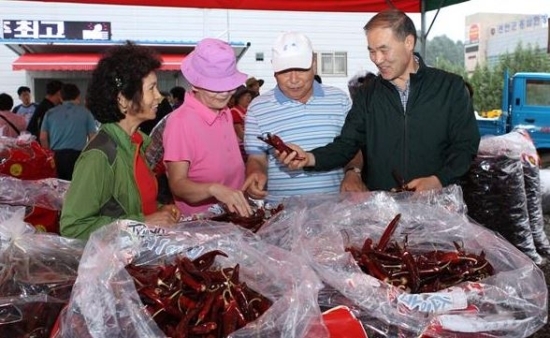 ▲ 14일 개장한 진안 고추시장에서 이항로 진안군수가 고추를 출하한 농민들과 얘기를 나누고 있다.