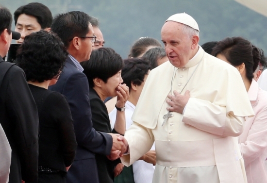 ▲ 프란치스코 교황이 14일 오전 경기도 성남 서울공항을 통해 도착한 뒤 세월호 유가족 대표들을 만나 위로의 말을 전하고 있다. 연합뉴스