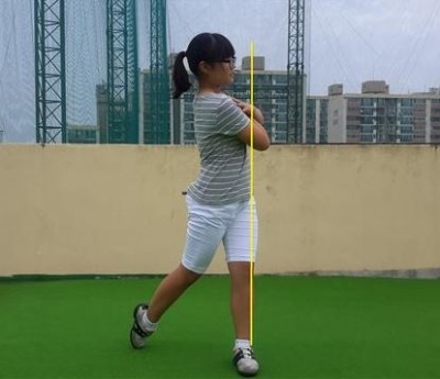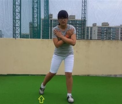 사진1과 같이 복사뼈를 기준으로 수직선을 무릎과 힙이 넘어가게 되는 것을 슬라이딩 되었다고 한다. 따라서 슬라이딩을 방지하기 위해서는 다음과 같은 연습방법이 많은 도움이 된다. 사진2와 같이 클럽을 사용하지 않고, 양손은 어깨에 대고 오른발 끝을 땅에 대고 세워서 어드레스 자세를 취한다.