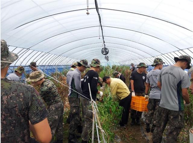 35사단 기동대대 장병 20여명은 지난 22일 임실읍 감성리 이상준씨 농가에서 침수된 비닐하우스 600평을 대상으로 정리작업을 펼쳤다.