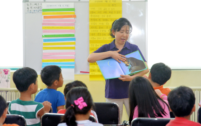 문화체육관광부가 후원하고 한국출판문화산업진흥원이 주최하는 ‘2014책 읽어주는 문화봉사단’ 공모에서 전라도 대표 주관기관으로 ‘개골개골어린이도서관’이 선정된 가운데 25일 전주 산너머종합복지관에서 실버 활동가들이 아이들에게 책을 읽어주고 있다.
