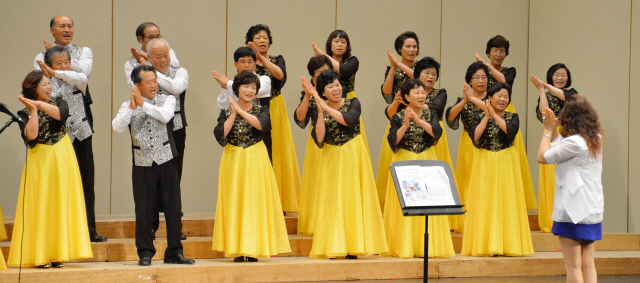광복 제69주년 경축 합창대회가 26일 전북대 삼성문화회관 공연장에서 열린 가운데 진안군 정천 스마일 합창단이 공연을 펼치고 있다.