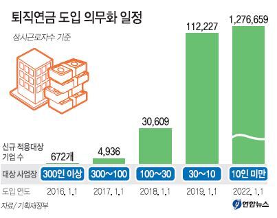 퇴직연금 도입 의무화는 2017년 300∼100인, 2018년 100∼30인, 2019년 30∼10인, 2022년 10인 미만 등 기업 규모별로 단계적으로 진행된다.