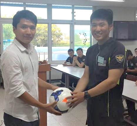 ▲ 전북현대 정혁 선수가 2308 전경대를 찾아 축구공을 전달하고 있다.