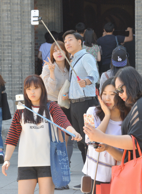 추석 연휴 마지막날이자 대체 휴일인 10일 전주 한옥마을 전동성당에서 관광객들이 스마트폰으로 사진을 찍으며 추억을 남기고 있다.
