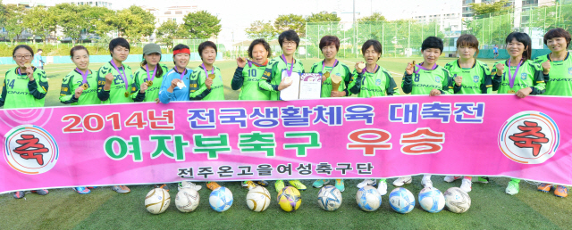 지난 8월 강원도 속초에서 열린 생활체육대축전 여성부 축구대회에서 역전 우승을 차지한 전주 온고을여성축구단 선수들이 아중체련공원에서 연습을 한 뒤 기념촬영을 하고 있다.