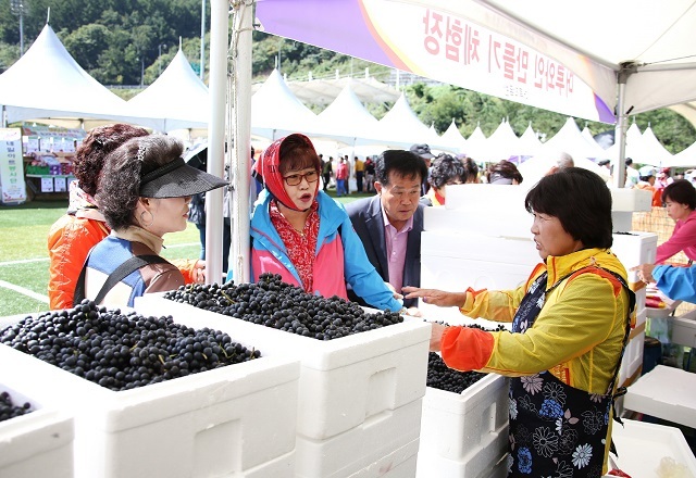 ▲ 무주 적상면민의 날을 기념하는 머루축제에서 도시민들이 머루를 구입하고 있다.