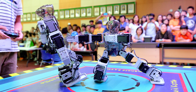 ▲ 20일 전북도청에서 열린 전북과학축전 ‘로봇 페스티벌’에 참가한 학생들이 자신이 만든 로봇으로 무선조종을 하며 휴머노이드 격투 경기를 벌이고 있다. 추성수기자 chss78@