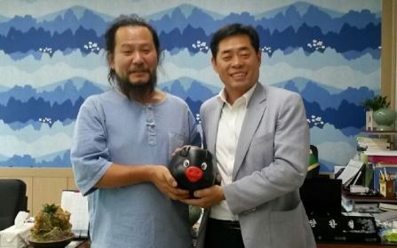 19살 연하 아내, 어린 딸과 함께 면사무소를 찾은 김용락(50) 씨가 1년동안 모은 흑돼지 저금통을 전달하기 위해서다.