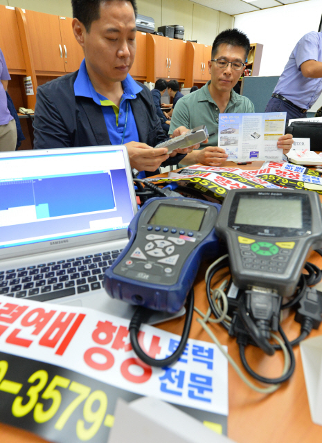 대형교통사고를 예방하기 위해 화물차 등에 설정된 최고속도제한장치를 무단으로 해체한 정비업자와 차주들이 경찰에 적발된 가운데 23일 전북지방경찰청 브리핑룸에서 압수물품을 공개하고 있다.