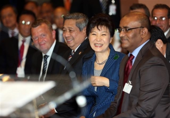 ▲ 환하게 웃는 박 대통령 23일 오후(현지시간) 유엔본부에서 열린 ‘글로벌 녹색성장 기구(GGGI) 의장 교대행사 개막식’에서 박근혜 대통령이 차기의장으로 추대된 유도요노 인도네시아 대통령(박 대통령 왼쪽) 등과 환하게 웃고 있다. ·연합뉴스