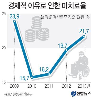 병의원 미치료자 중 경제적 이유를 든 비율은 지난해 21.7%로, 2009년 23.9%에서 2010년 15.7%로 뚝 떨어진 이후 2011년 16.2%, 2012년 19.7%로 다시 꾸준히 늘어나고 있다. 병원에 가지 못한 사람의 다섯 명 중 한 명은 돈이 없어서 치료를 받지 못지 셈이다. ·연합뉴스