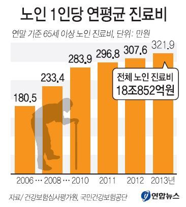 노인 1인당 연평균 진료비도 2006년 180만원에서 2008년 233만원, 2010년 284만원, 지난해 322만원으로 빠르게 늘어났다. 국민 전체의 1인당 진료비 102만원의 3배가 넘는 금액이다. 연합뉴스