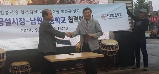 남원 공설시장상인회(회장 권정현)와 남원초등학교(교장 조내화)가 지난 29일 오후 공설시장 미디어센터에 마련된 특설 무대에서 전통시장 활성화 및 어린이 문화예술교육을 위한 업무협약(MOU)을 체결했다.