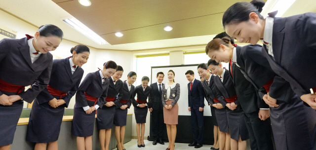 ▲ 이스타항공이 지역인재 채용에 앞장서 향토기업의 모범이 되고 있는 가운데 14일 전주 서신동 예약센터 강당에서 신입 승무원들이 친절교육을 받고 있다. 추성수기자