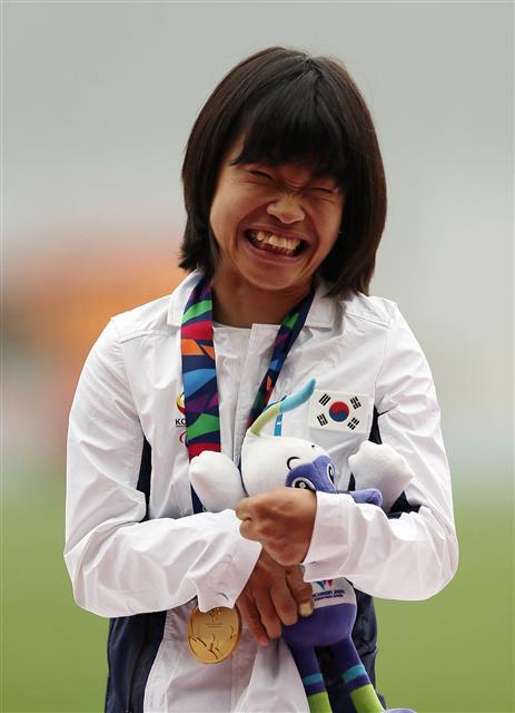▲ 20일 2014 인천 장애인 아시안게임 육상 여자 100m T36 결승 시상식에서 금메달을 받은 한국 전민재가 활짝 웃고 있다. 연합뉴스