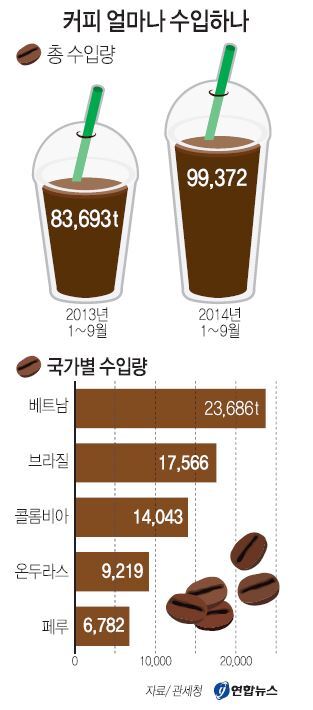 특히 올해 커피 수입중량은 1990년 이후 가장 많은 양이 수입됐던 2011년 1∼9월(9만2040t) 기록을 앞지르고 있어 최대 기록을 경신할 것으로 보인다.