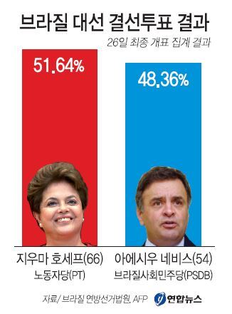 26일(현지시간) 브라질 대선 결선투표에서 집권 중도좌파 노동자당(PT) 후보인 지우마 호세프(66·여) 대통령이 승리했다.