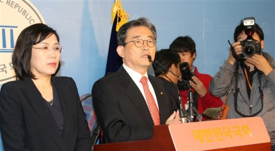 ▲ 새누리당 공무원연금 제도개혁 태스크포스(TF)를 이끄는 이한구 위원장과 김현숙 원내대변인이 27일 국회 정론관에서 당의 공무원연금 개혁안을 발표하고 있다. 연합뉴스