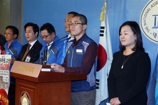 ▲ 이충재 공무원노조위원장을 비롯한 공적연금 개악 저지를 위한 공동투쟁본부 조합원들이 27일 새누리당 공무원연금법 개정안에 반대하는 기자회견을 하고 있다. 연합뉴스
