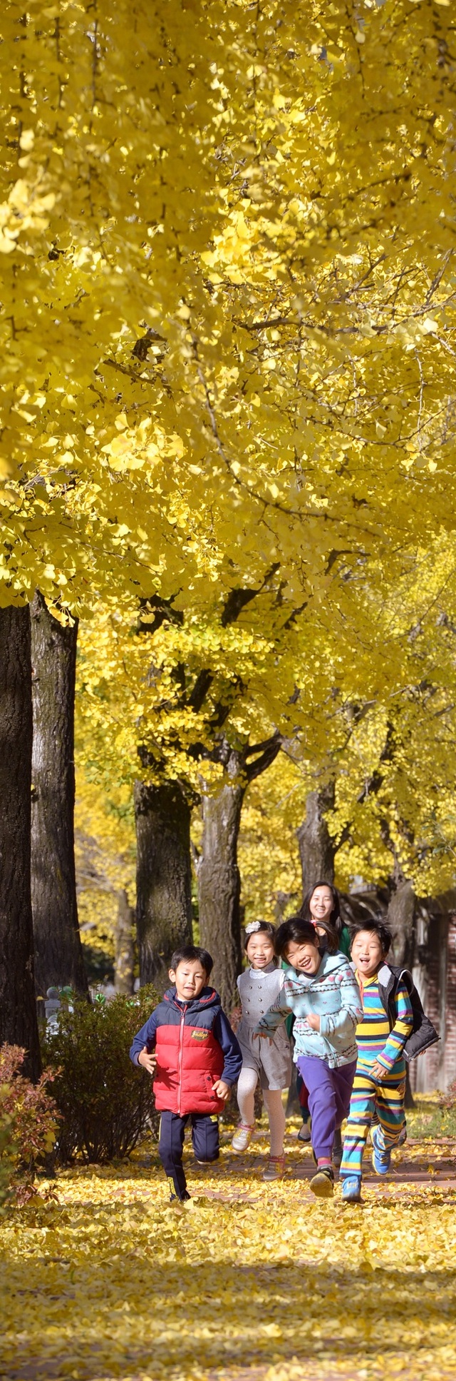27일 임실 성수초등학교 앞 가로수 길. 노란 은행잎이 융단처럼 깔린 길을 달리는 아이들의 모습이 정겹다.