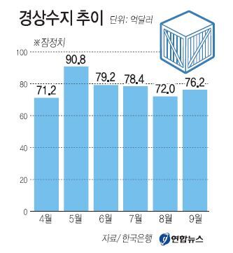 한국은행이 29일 발표한 ‘9월 국제수지(잠정)’에 따르면 지난달 경상수지가 76억2000만달러 흑자로 집계됐다. 8월의 72억달러 흑자보다 4억2000만달러 증가했다.