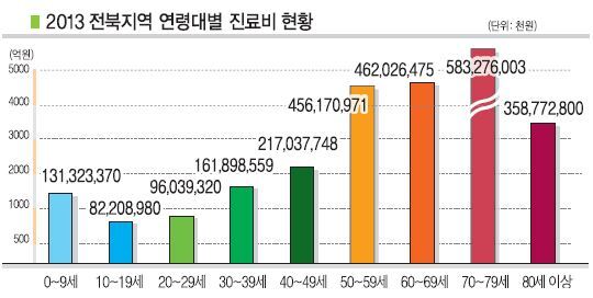 이처럼 의료비 지출이 많은 것은 노령인구가 꾸준히 증가하고 있기 때문이다. 실제로 2013년 말 기준 도내 65세 이상 고령인구의 비중이 17.5%이며, 시·군별로는 전주·군산·익산·완주를 제외한 10개 시·군이 20%를 넘어 이미 초고령사회에 진입한 상태다.