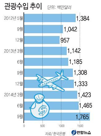 관광수지는 2012년 5월에 9670만달러의 흑자를 내고서 내국인의 해외 관광 증가와 엔저에 따른 일본인 관광객 감소 등의 영향으로 27개월간 적자 행진을 이었다.