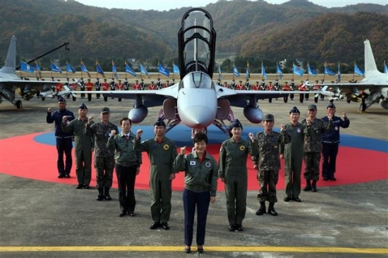 ▲ FA-50 전투기와 함께 기념촬영하는 박 대통령 박근혜 대통령이 30일 오후 강원도 원주비행장에서 열린 ‘국산전투기 FA-50 전력화 기념식’에서 전투기를 배경으로 기념촬영하고 있다. 연합뉴스