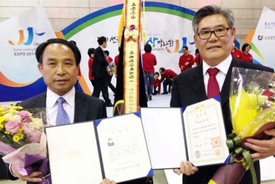 ▲ 정읍 샘고을시장이 2014 전국우수시장박람회에서 최우수 전통시장에 선정돼 대통령상을 수상했다. 배현오 정읍시청 민생경제과장(왼쪽)과 고광호 상인회장이 인증서와 표창장을 들고 기념촬영을 하고 있다.