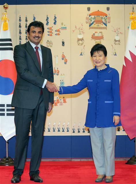 ▲ 박근혜 대통령이 5일 오후 청와대를 방문한 셰이크 타밈 빈 하마드 알 타니 카타르 국왕과 정상회담을 하기 전 기념촬영을 하며 악수하고 있다. 연합뉴스