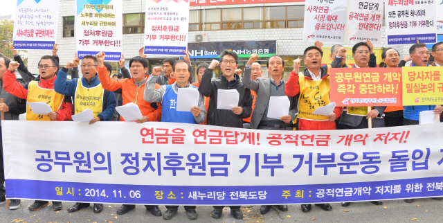 ‘공적연금 개악 저지를 위한 전북공동투쟁본부’는 6일 새누리당 전북도당 당사 앞에서 회견을 갖고 “공무원의 노후 생존권을 당사자의 의견수렴 절차도 없이 짓밟은 새누리당에게 앞으로는 단 한푼의 정치 후원도 할 수 없다”고 주장했다.