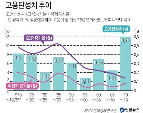 ‘베이비붐 세대’가 점차 노동 시장에서 빠져나가고 취업자 규모가 줄어들면서 지금까지의 ‘일자리 부족’ 현상이 ‘노동력 부족’ 현상으로 전환한다는 것이다. 특히 김 연구원은 성장과 고용의 상관관계가 반전되는 현상에 주목해야 한다고 강조했다. 이른바 ‘고용탄성치’(고용증가율/경제성장률)가 급상승했다는 점에서다. 뉴스