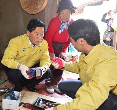 박 군수는 보일러 순환모터 고장 등으로 보일러를 사용하지 못하고 전기장판 한 장에 의지하여 추위를 나고 있는 부안면 김연순(78세) 할머니 가정을 방문, 기동처리반과 함께 보일러를 수리하고 애로사항을 청취했다.