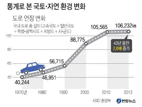 국내에 깔린 도로의 총 길이는 43년 전보다 약 2.6배 늘어난 것으로 조사됐다. 이 중 고속도로는 7배 이상 증가했다.