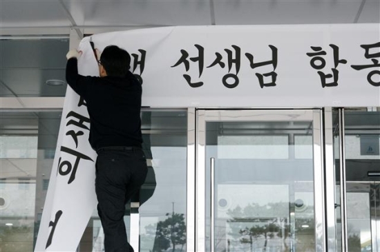 ▲ 전북도교육청 정문에 걸려있던 세월호 분향소 안내 현수막이 철거되고 있다. 권혁일 기자