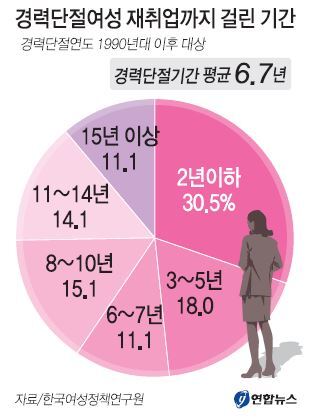 14일 한국여성정책연구원이 발간한 ‘여성 경력단절 예방 강화를 위한 법·제도 개선방안 연구’(김영옥·오은진·한지영) 보고서에 따르면 경력단절 여성이 재취업하기까지 걸리는 시간은 평균 6.7년으로 나타났다.