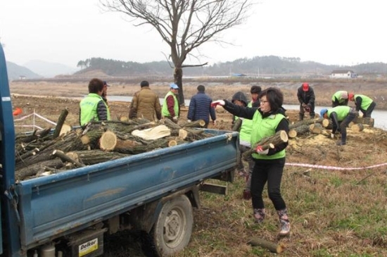 ▲ 지난 11일 순창 유등면 자율방재단이 하천변의 유수지장목 제거작업에서 발생된 수목을 저소득 노인에게 땔감으로 전달하기 위해 정리하고 있다.
