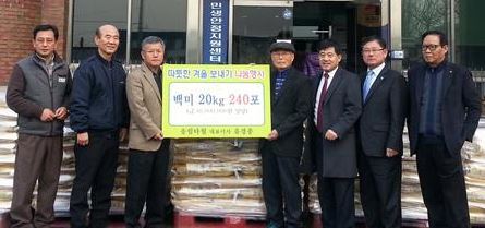 ▲ 유경종 송림타올 대표(오른쪽서 네번째)가 지난 11일 요촌동 주민센터를 찾아 어려운 이웃에 백미 240포를 기탁하고있다.