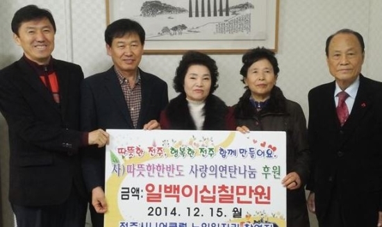 ‘전주시니어클럽(대표 유두희)’과 ‘전주일하는실버클럽(회장 권오신)’이 ‘사랑의 연탄 나누기 운동’에 참여해 15일 연탄 1500장에 해당하는 성금 127만원을 (사)따뜻한 한반도 사랑의 연탄나눔운동 전주지부(지부장 최인규)에 전달했다.