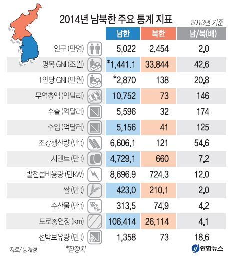 16일 통계청이 국내외 북한관련 통계를 수집해 발간한 ‘2014년 북한의 주요통계지표’(2013년 기준)에 따르면, 북한의 1인당 GNI는 138만원으로 조사됐다. 남한은 2870만원으로 북한보다 20.8배 높았다. 뉴스