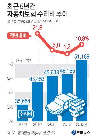 자동차수리비는 지급된 보험금은 2010년 4조원을 돌파한 이후 3년 만에 다시 5조원을 넘어섰다. 2011년 이후에 전년대비 한자릿수 증가를 보였으나 2013년에는 다시 두자릿수 증가율을 나타냈다.