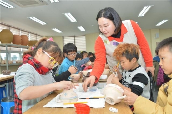 ▲ 지난 19일 순창 옹기체험관에서 지역 초등학생 100여 명이 직접 옹기를 만들어보고 있다.