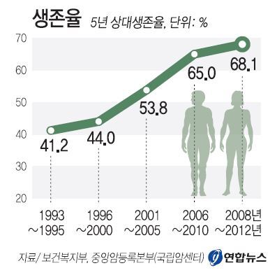 23일 보건복지부와 중앙암등록본부가 발표한 국가암등록통계에 따르면 최근 5년간(2008∼2012년) 암을 진단받은 환자의 5년 상대생존율은 68.1%였다. 이 기간 암 발생자 3명 가운데 2명은 5년 이상 생존한다는 것이다.