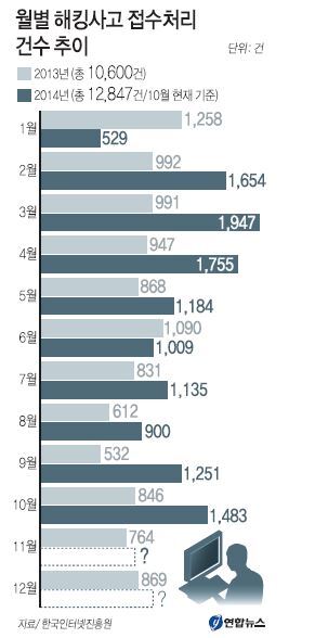 24일 한국인터넷진흥원(KISA)의 인터넷 침해사고 대응통계에 따르면 올해 10월까지 접수된 해킹사고는 1만2847건으로, 지난해 발생한 해킹사고 접수처리 총 건수인 1만600건보다 무려 2247건 많다. 11월과 12월 통계까지 나온다면 차이는 더 커질 것으로 보인다.